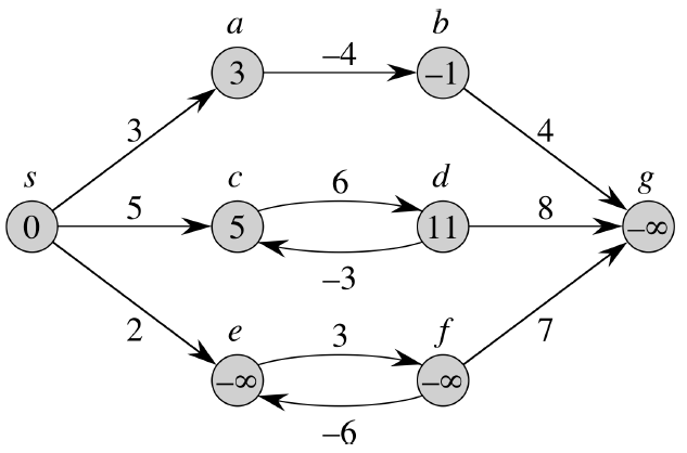 위의 그림에서 c,d와 e,f가 사이클을 이루고 있는 것을 볼 수 있다. c, d 의 경우에는 사이클을 돌수록 distance가 커져서 최단 경로를 구할 때 문제가 되지 않지만, e,f 의 경우에는 사이클을 돌수록 distance가 작아져서 최단 경로를 구하는 것이 의미가 없어진다.