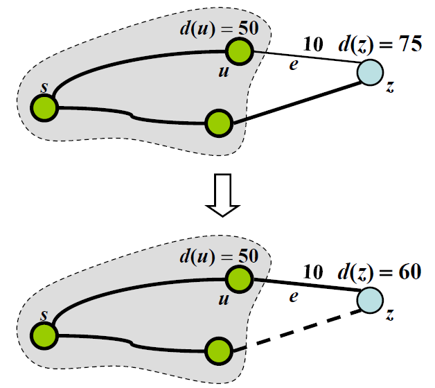기존의 d(z)가 75였는데 탐색 과정에서 d(u)+e = 60으로 길이가 더 짧을 때, 노드와 엣지의 정보를 업데이트 해주는 것을 말한다.