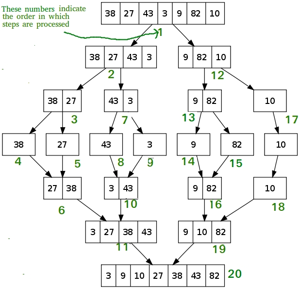 리스트를 두 개의 균등한 크기로 분할하고 분할된 부분리시트를 정렬한다.
