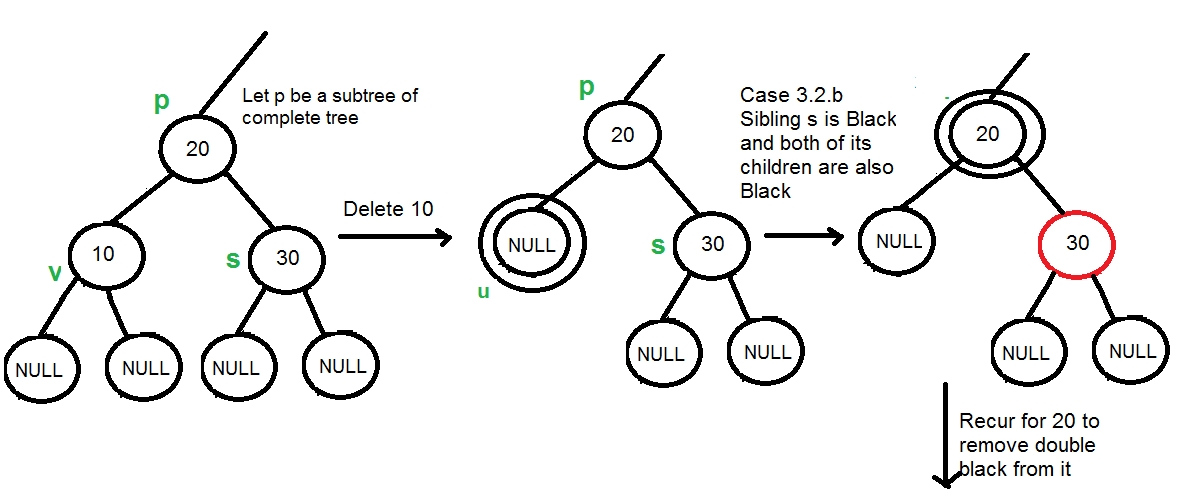 void delete_case4(struct node *n) { struct node *s = sibling(n); if ((n->parent->color == RED) && (s->color == BLACK) && (s->left->color == BLACK) && (s->right->color == BLACK)) { s->color = RED; n->parent->color = BLACK; } else delete_case5(n); }