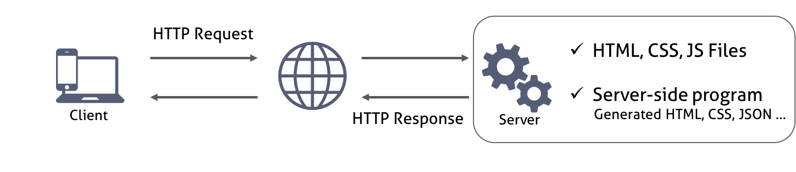 μλ²μ λΈλΌμ°μ μμ ν΅μ μ μν κ²μΈλ°, μλ²λ μμ²λ°μ νμ΄μ§(HTML)λ₯Ό λ°ννλ€. μ΄λ HTMLμμ λ‘λνλ CSS, JavaScript νμΌλ€λ κ°μ΄ λ°νλλ€. ν΄λΌμ΄μΈνΈμ μμ²μ λ°λΌμ μλ²λ μ μ μΈ νμΌ, μλ² μ¬μ΄λ νλ‘κ·Έλ¨μ΄ λ§λλ νμΌ, λ°μ΄ν°λ₯Ό λ°νν μλ μλ€. μλ²λ‘ λΆν° μΉνμ΄μ§κ° λ°νλλ©΄ ν΄λΌμ΄μΈνΈ(λΈλΌμ°μ )λ μ΄λ₯Ό λ λλ§νμ¬ νλ©΄μ νμνλ€.